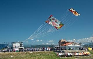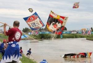 中之口川(川幅80メートル)の両岸から24畳の大凧を揚げ、空中で絡ませ川に落し、相手の凧綱が切れるまで引き合う勇壮な世界最大スケールの大凧合戦。越後平野の初夏を彩る風物詩として親しまれている新潟県を代表する伝統行事です。