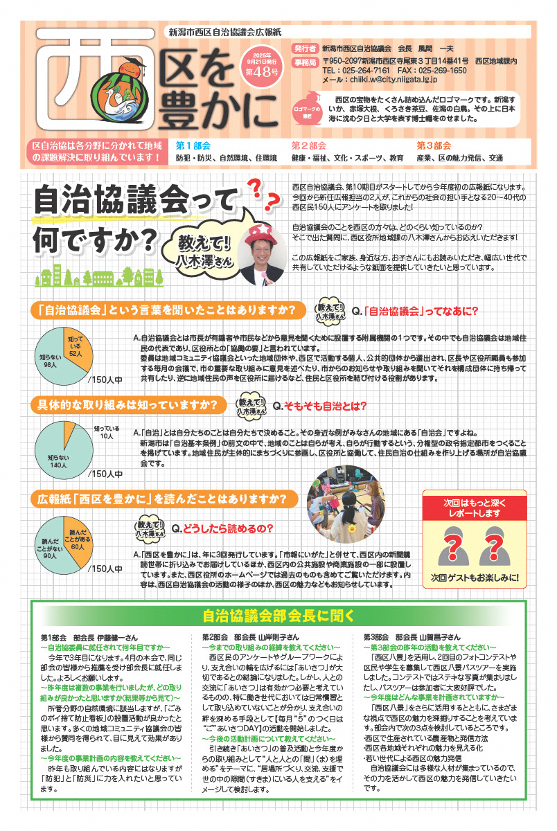西区自治協議会では、同協議会の活動をお知らせし、様々な地域課題の解決に向け、区民の皆さまと一緒になって取り組むことを目的に、独自の広報紙「西区自治協議会広報紙『西区を豊かに』」を発行しています。