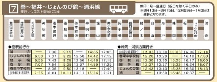 - 「巻駅前」乗車、「浦浜」下車(約30分)、「浦浜コース」登山口まで徒歩約4分